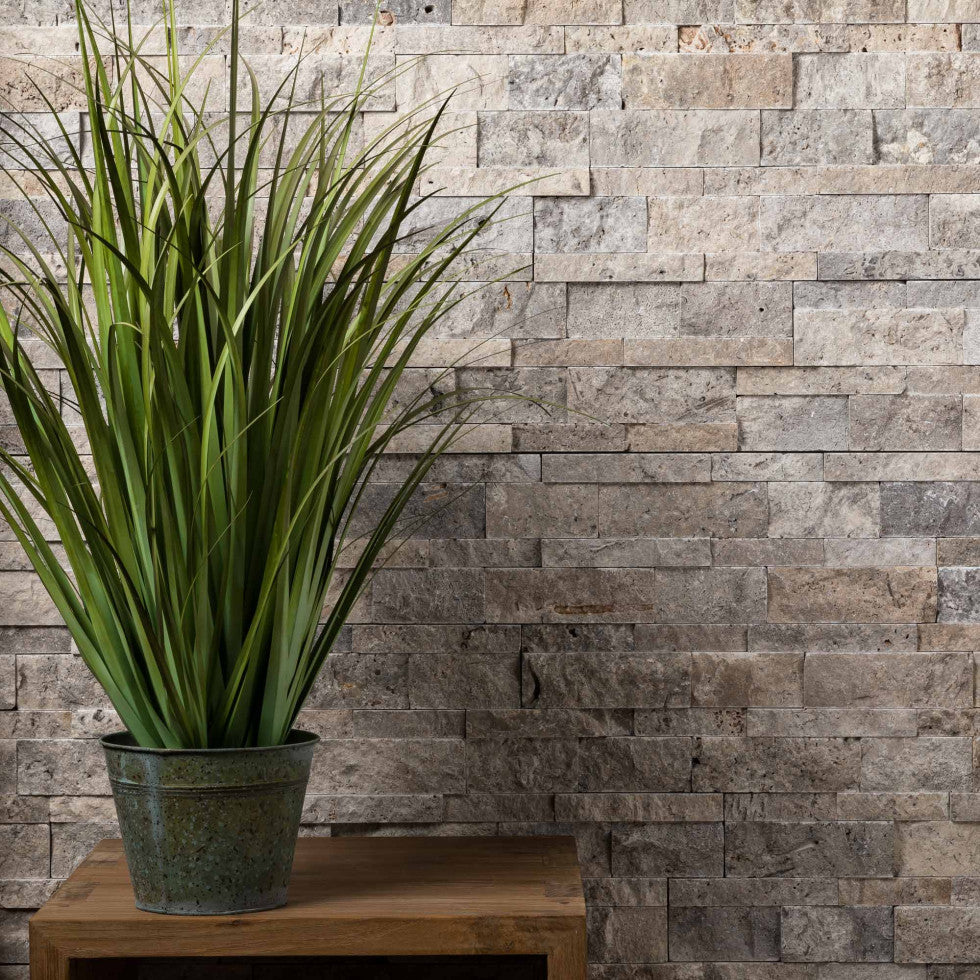Mots-clés : parement travertin silver, pierre grise, mur pierre, 30,5×30,5.