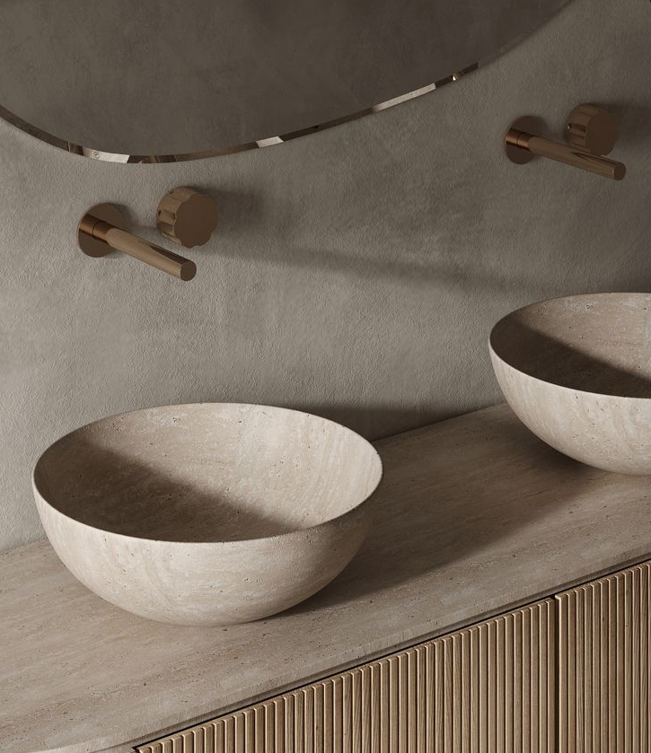 Vasque bol en travertin Classic Mix. Profil Type 2 : courbe plus profonde, col légèrement resserré.