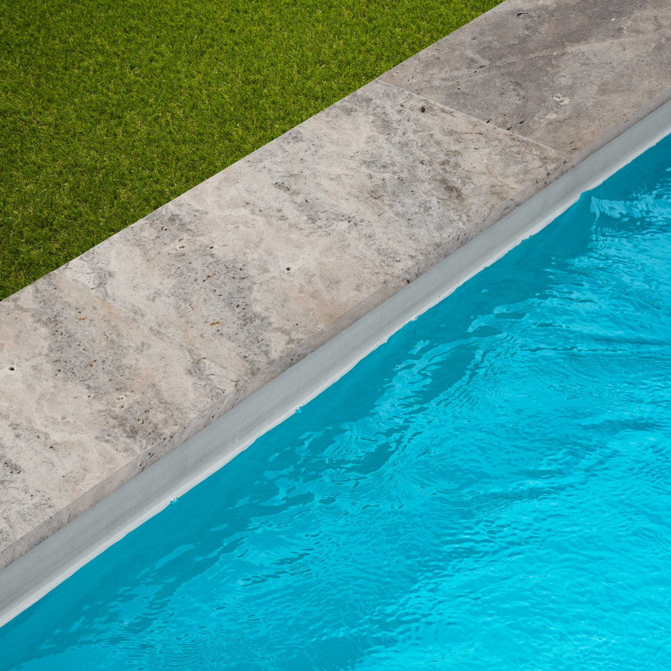 Margelle en travertin Silver aux teintes grises élégantes, finition vieillie, parfaite pour piscines modernes.