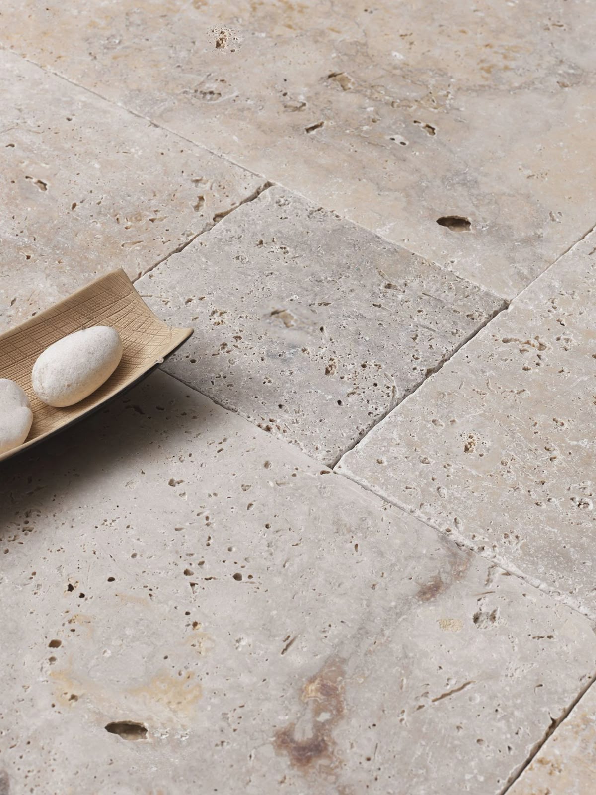Mots-clés : travertin martelé, finition vieillie, antidérapant, terrasse rustique chic.
